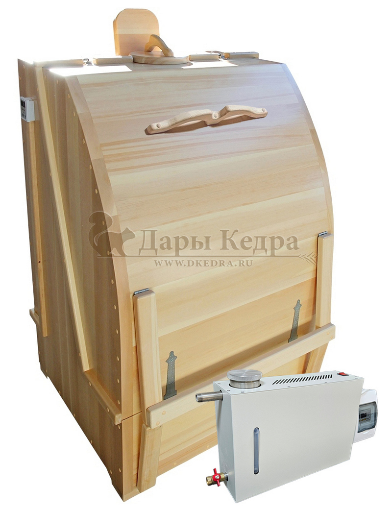 Готовый комплект «Доступный»: кедровая бочка с парогенератором Готовый комплект - это полностью укомплектованный набор с фитобочкой для процедур парения. Круглая модель наиболее компактна и мобильна. Толщина стенок составляет 25 мм. Фитобочка оборудована откидными створками, дверцей и отверстием для головы. Во время парения человек сидит внутри кедровой бочки, а голова находится снаружи. Благодаря этому исключается возможность перегрева. Подлокотники из кедра, встроенные ручки на створках и двери делают эксплуатацию более удобной. Парение в фитобочке благотворно влияет на организм в целом: повышается иммунитет, выводятся шлаки и токсины, улучшается работа органов тела и состояние кожи.