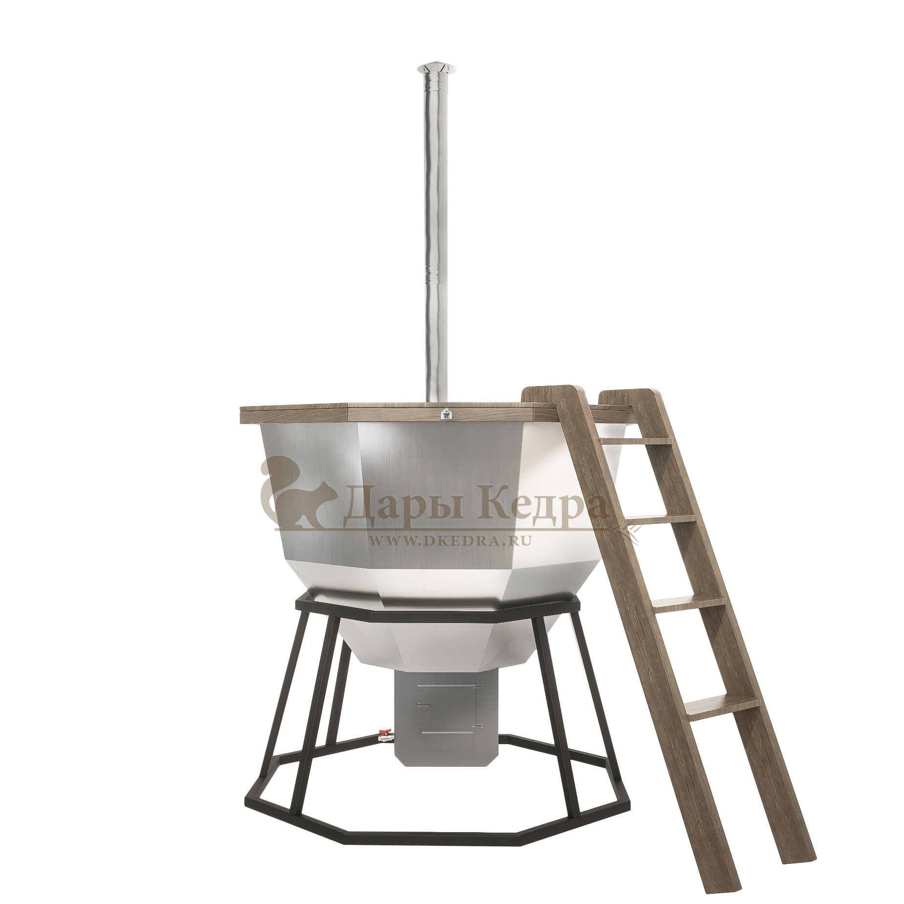 Банный чан из нержавеющей стали Ø-2350 на подставке с приставной печью Банный чан с приставной печкой изготовлен из пищевой стали. Представляет собой большую ёмкость в виде чаши, при нагревании которой можно париться на свежем воздухе. Чан установлен на устойчивую металлическую подставку и оснащен приставной печью с дымоходом. Банный чан оборудован кедровым бортом, скамейками, подспинниками, трапом для ног и приставной лестницей.