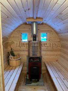 Это изделие круглой вытянутой формы с одним парильным отделением. Внутреннее пространство включает в себя печь у дальней стены и лавки из кедра по обе стороны бани. За счет компактной формы баня нагревается в течение 30 минут. По вашему желанию ее можно укомплектовать козырьком, верандой и печью с внешней загрузкой, благодаря которой весь мусор после топки остается на улице. Круглая баня-бочка не требует полноценный фундамент, поэтому при необходимости ее можно перенести в другое место.