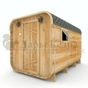 Это прямоугольное изделие с закругленными углами. За счет такой конструкции во время топки воздух циркулирует по кругу, поэтому баня-бочка нагревается не более 30 минут. Баня включает в себя раздевалку и парилку. Лавочки из кедра установлены по всей длине бани-бочки с обеих сторон. Печь расположена в парилке около дальней стены. Для удобства пользования в раздевалке находится вешалка и полочка из кедра. По вашему желанию баню-бочку квадро можно укомплектовать козырьком, верандой и печью с внешней загрузкой, благодаря которой весь мусор после топки остается на улице. Баня-бочка квадро не требует полноценный фундамент, поэтому при необходимости ее можно перенести в другое место.